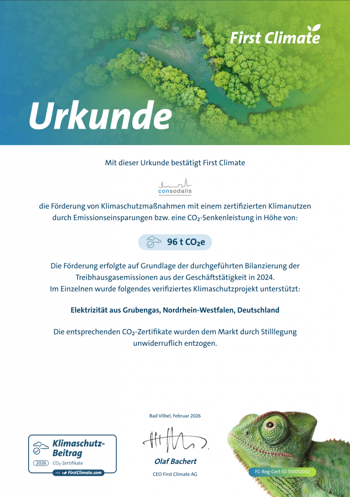 Wir haben unseren CO2-Fußabdruck für das Jahr 2024 mit Hilfe des Rechners von First Climate ermittelt. Anschließend haben wir CO2-Zertifikate in dem Umfang erworben, der unserem CO2-Fußabdruck entspricht.